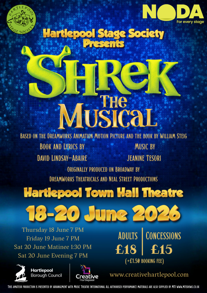 Join the NODA award-winning Hartlepool Stage Society for an evening of enchantment, laughter, and that famous story of friendship – and discover why life’s better with a little mud. Grab your tickets today and let your inner ogre roar!